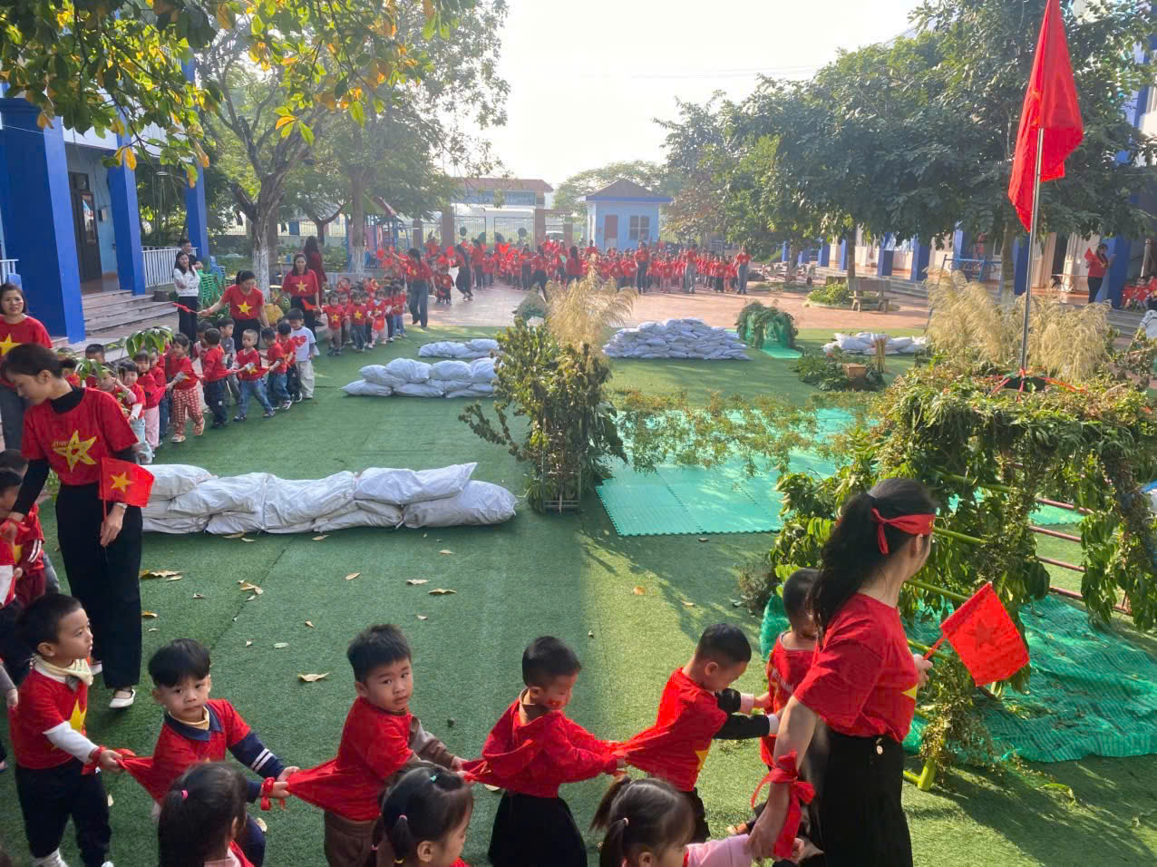 Các con cùng nhau mặc áo cờ đỏ sao vàng rực rỡ 🌟, xếp hàng ngay ngắn, luyện tập theo đội hình và học về tinh thần kỷ luật, lòng yêu nước cũng như sự dũng cảm của những chú bộ đội đang ngày đêm bảo vệ Tổ quốc 🇻🇳. Các chiến sĩ nhí còn được trải nghiệm vượt chướng ngại vật – rèn luyện bản lĩnh – tinh thần kiên trì như những chú bộ đội thực thụ 🇻🇳✨