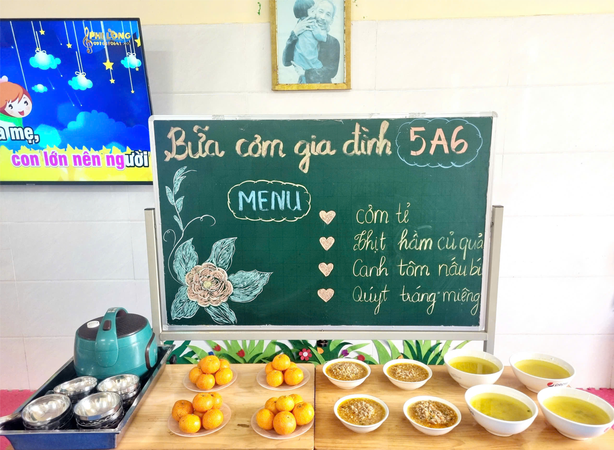 Bữa cơm gia đình là một hoạt động ý nghĩa và vô cùng cần thiết đối với các thành viên trong gia đình sau một ngày làm việc. Để giúp các con hiểu được ý nghĩa của bữa cơm gia đình và có được những kĩ năng cần thiết trong ăn uống, Lớp 5A6 tổ chức "Bữa ăn gia đình". Thông qua bữa cơm gia đình, các con học được kĩ năng sống cần thiết như sự chủ động trong việc chọn món ăn phù hợp với sở thích, nề nếp văn hóa trong mâm cơm gia đình. Cách sử dụng thành thạo các dụng cụ trong ăn uống còn rèn cho các con tính tự lập, tự phục vụ bản thân . Quan trọng hơn giúp các con hiểu được để có bữa ăn ngon cần có bàn tay chăm sóc của các cô trong nhà trường, từ đó các con biết thể hiện lòng biết ơn của mình đối với các cô.... Các bé học sinh lớp 5A6 đã rất hào hứng vui vẻ với hình thức thức tổ chức bữa ăn này