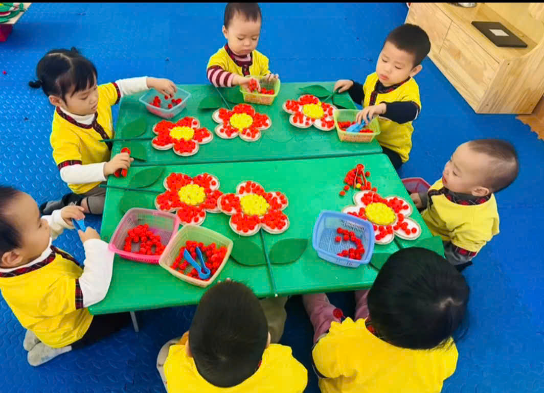 Mời ba mẹ cùng xem các bé lớp NT D2 thực hiện vận động gắp dính viên bông trang trí cánh hoa ạ