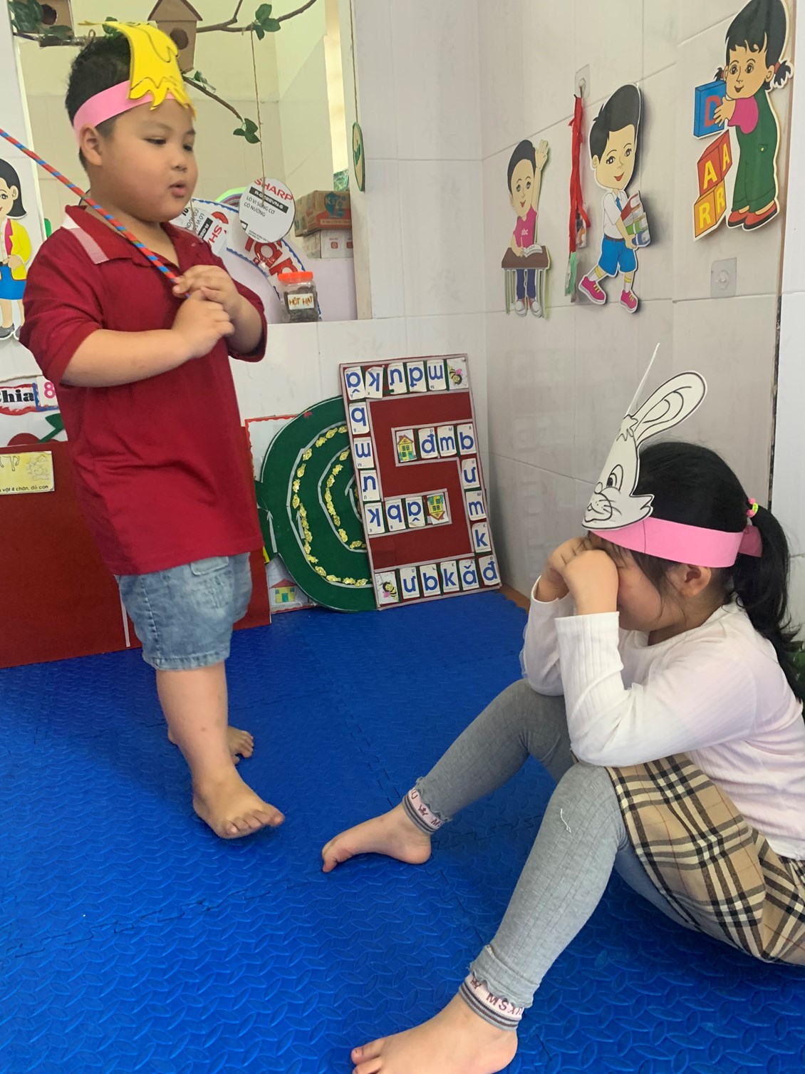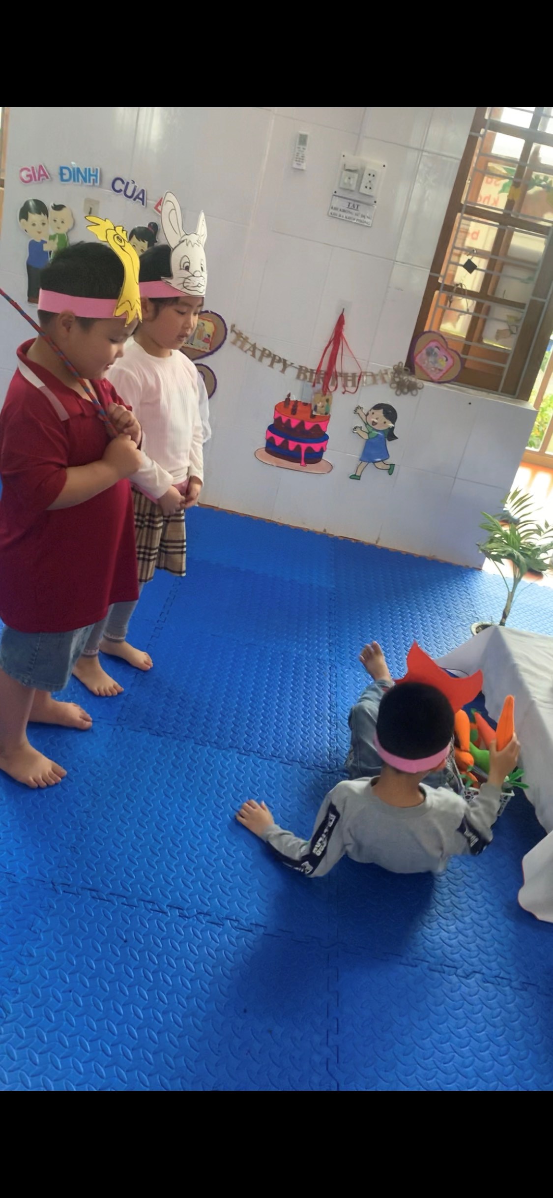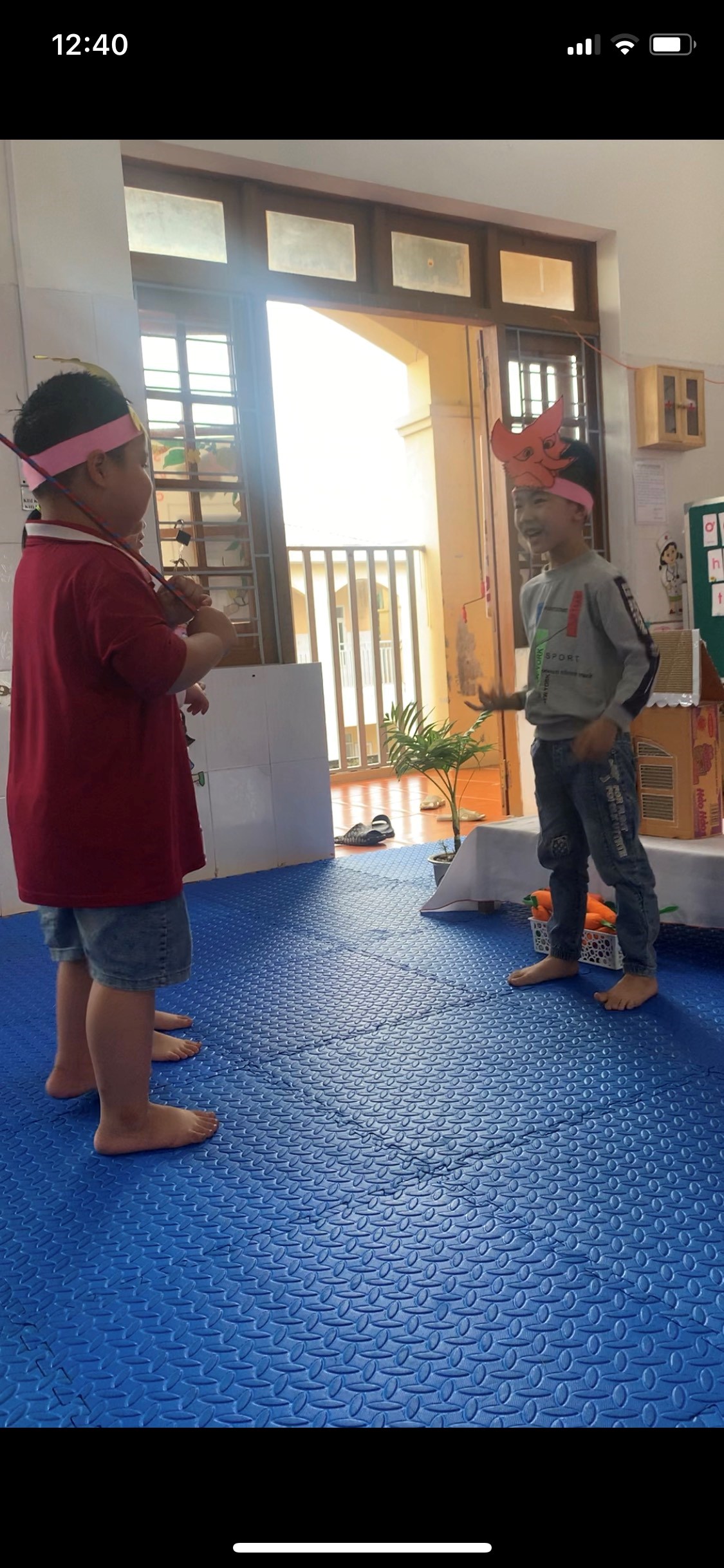 Tiết học kể chuyện đóng kịch Cáo - Thỏ và Gà Trống của lớp 5A3. Qua tiết học trẻ nhớ tên truyện “Cáo, Thỏ và Gà Trống” trẻ được hoá thân vào làm những nhân vật mà trẻ yêu thích. Thể hiện được ngữ điệu giọng, cử chỉ điệu bộ của từng nhân vật. Thông qua câu chuyện giáo dục trẻ luôn tự tin, có lòng dũng cảm, biết giúp đỡ người khác khi gặp khó khăn. Biết yêu quý các con vật nuôi.