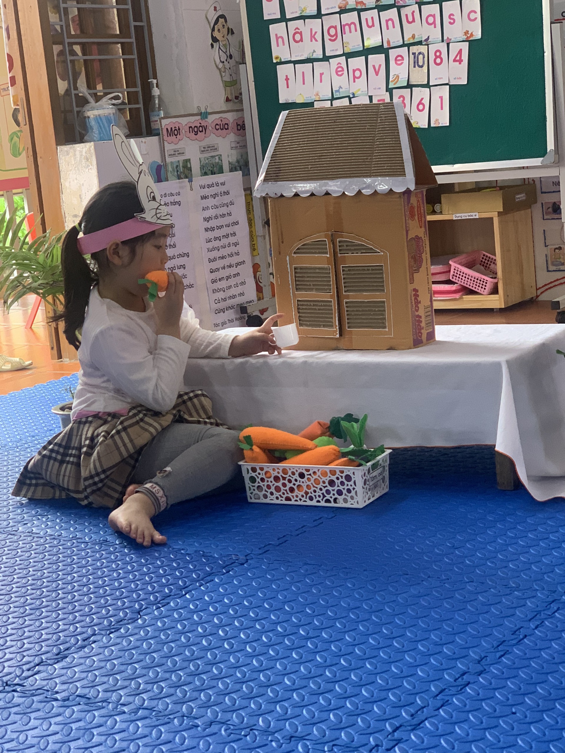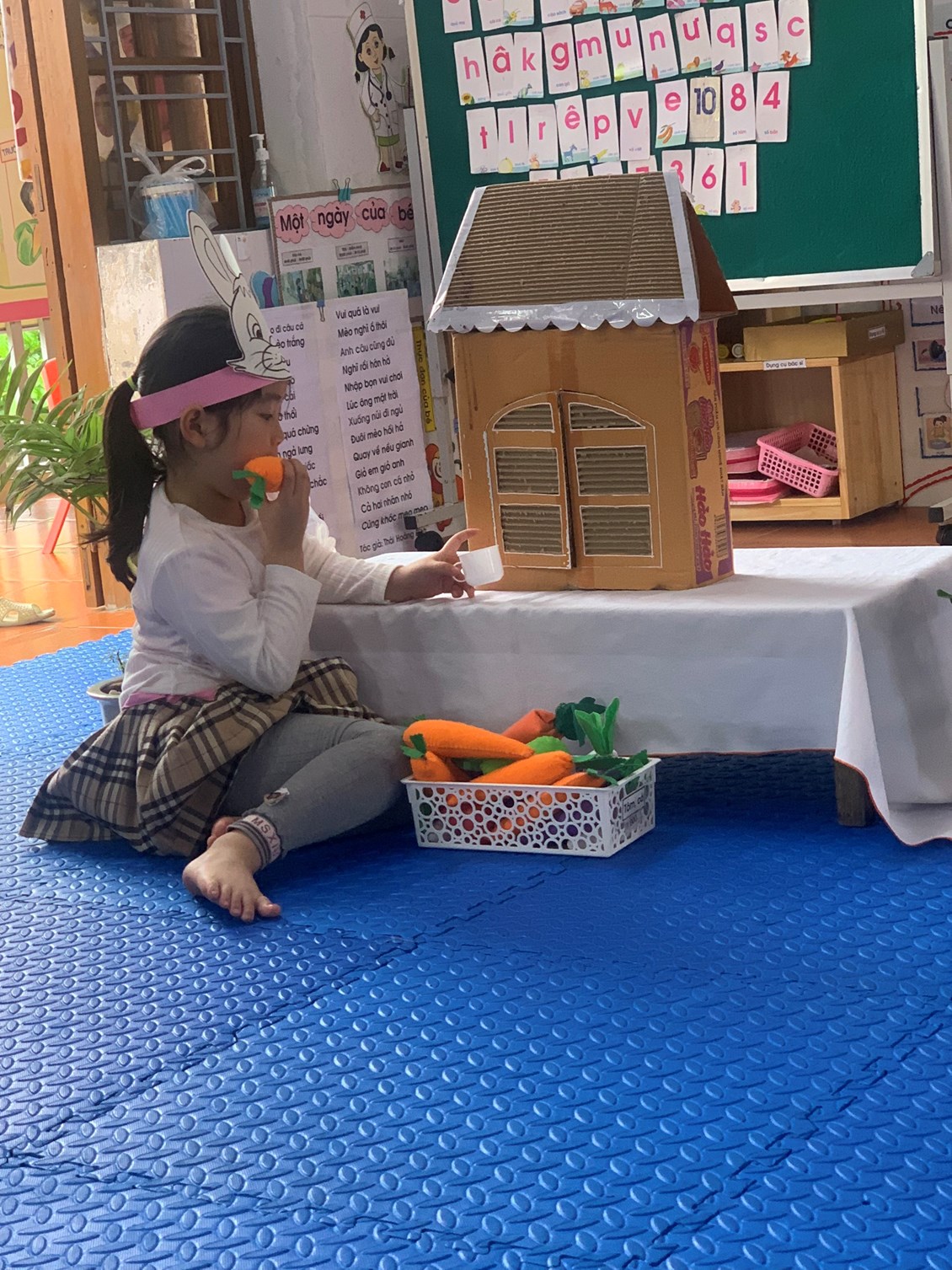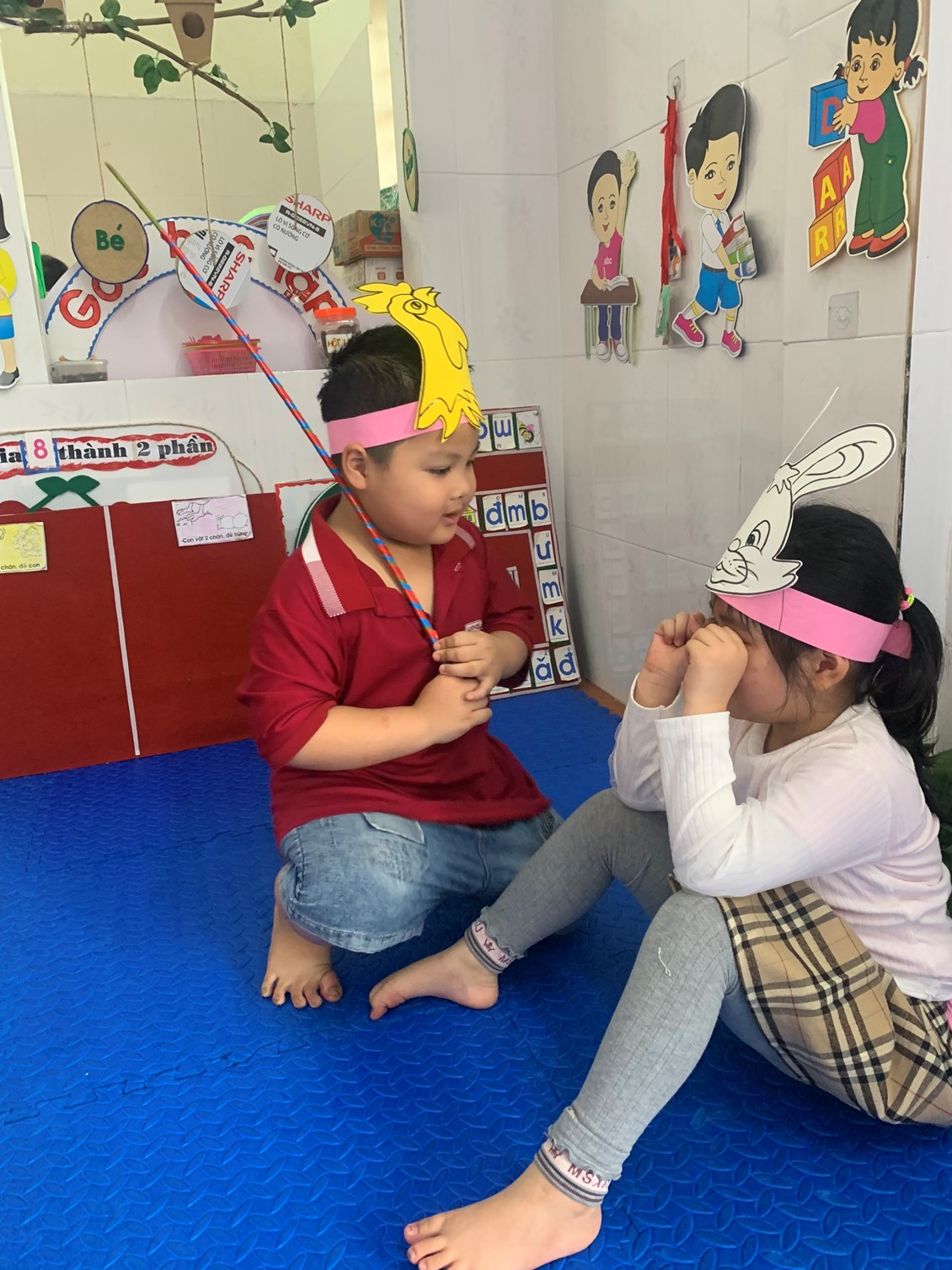Tiết học kể chuyện đóng kịch Cáo - Thỏ và Gà Trống của lớp 5A3. Qua tiết học trẻ nhớ tên truyện “Cáo, Thỏ và Gà Trống” trẻ được hoá thân vào làm những nhân vật mà trẻ yêu thích. Thể hiện được ngữ điệu giọng, cử chỉ điệu bộ của từng nhân vật. Thông qua câu chuyện giáo dục trẻ luôn tự tin, có lòng dũng cảm, biết giúp đỡ người khác khi gặp khó khăn. Biết yêu quý các con vật nuôi.