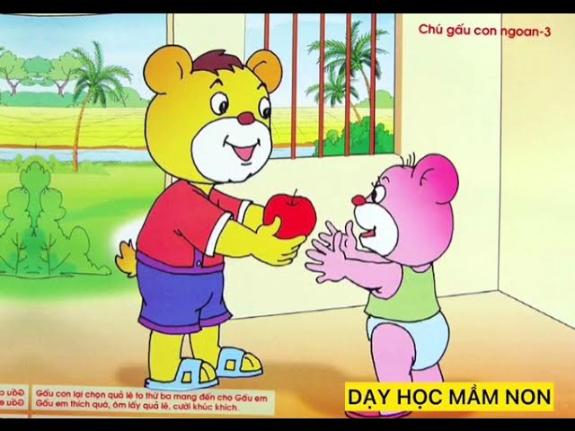 Gấu con lại chọn quả lê to thứ ba mang đến cho Gấu em. Gấu em thích quá, ôm lấy quả lê, cười khúc khích. Gấu con thấy Gấu em vui cũng vui theo.