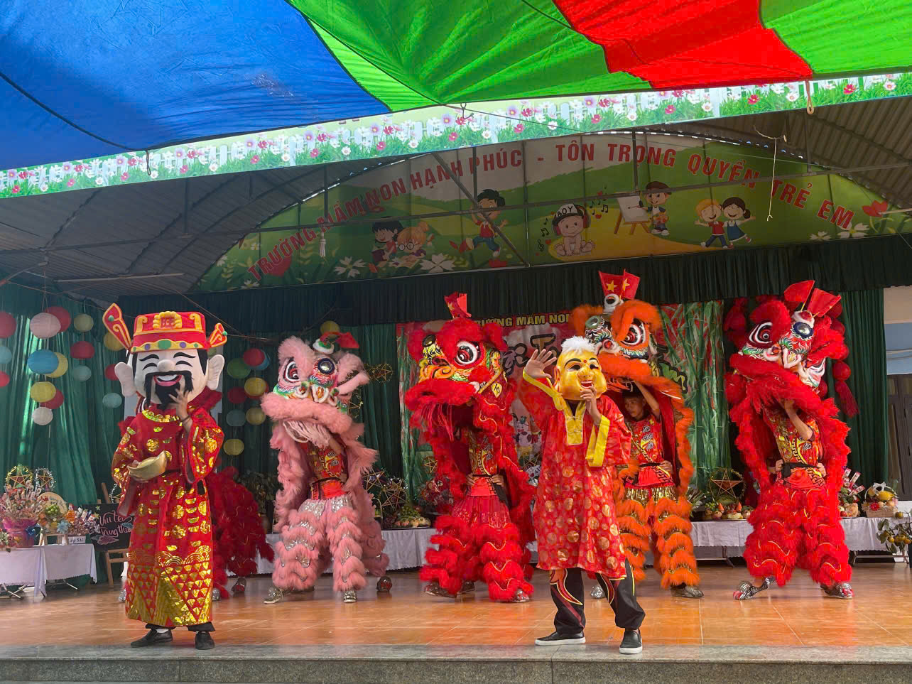 khí tại trường rộn ràng, tràn ngập sắc màu của đèn lồng và tiếng trống sư tử vang lên vui nhộn. Nhà trường, cô giáo và các bậc phụ huynh đã chuẩn bị chu đáo mâm cỗ Trung thu với nhiều bánh kẹo, hoa quả tươi ngon cho các bé.