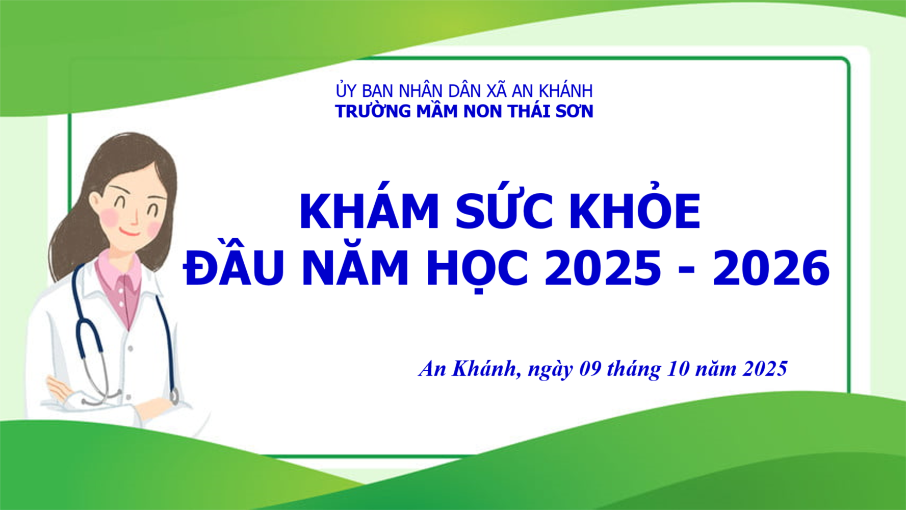 Hôm nay ngày 09/10/2025 Trường Mầm non Thái Sơn phối hợp với Trạm Y tế xã An Khánh số 3 tổ chức khám sức khỏe định kỳ đầu năm học 2025-2026 cho 100% các cháu trong nhà trường với các nội dung kiểm tra: Cân nặng, chiều cao, khám tai, mắt, mũi, họng, kiểm tra tim phổi và một số bệnh liên quan đến đường hô hấp, da liễu ...