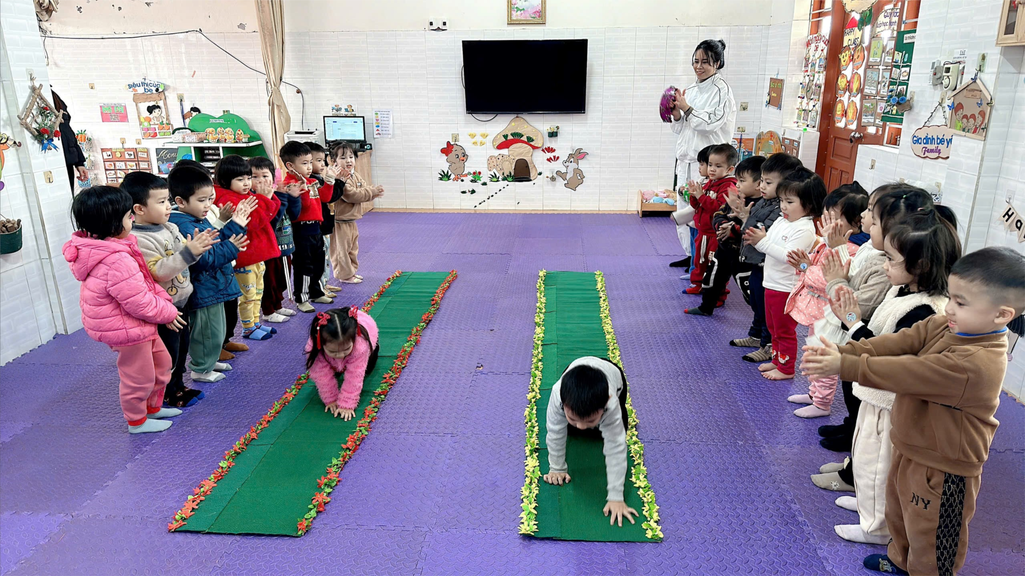 Giáo dục thể chất cho trẻ mầm non là hình thức giáo dục tác động nhiều mặt đến cơ thể của trẻ thông qua các hoạt động vận động và sinh hoạt khoa học. Mục đích nhằm giúp cơ thể trẻ luôn được khỏe mạnh, tăng cường sức đề kháng và phát triển cân đối, hài hòa cả về thể chất và trí tuệ. Thông qua giờ học : "Bò trong đường hẹp" không những rèn luyện sức khoẻ, cải thiện sự khéo léo và khả năng phối hợp nhóm. Mà còn giúp trẻ hình thành thói quen kiên nhẫn, tự tin, tự chủ và sáng tạo. Dưới đây là những hình ảnh các bé lớp 3C3 tham gia hoạt động “Bò trong đường hẹp”. Xin mời ba mẹ cùng các bé xem nha!